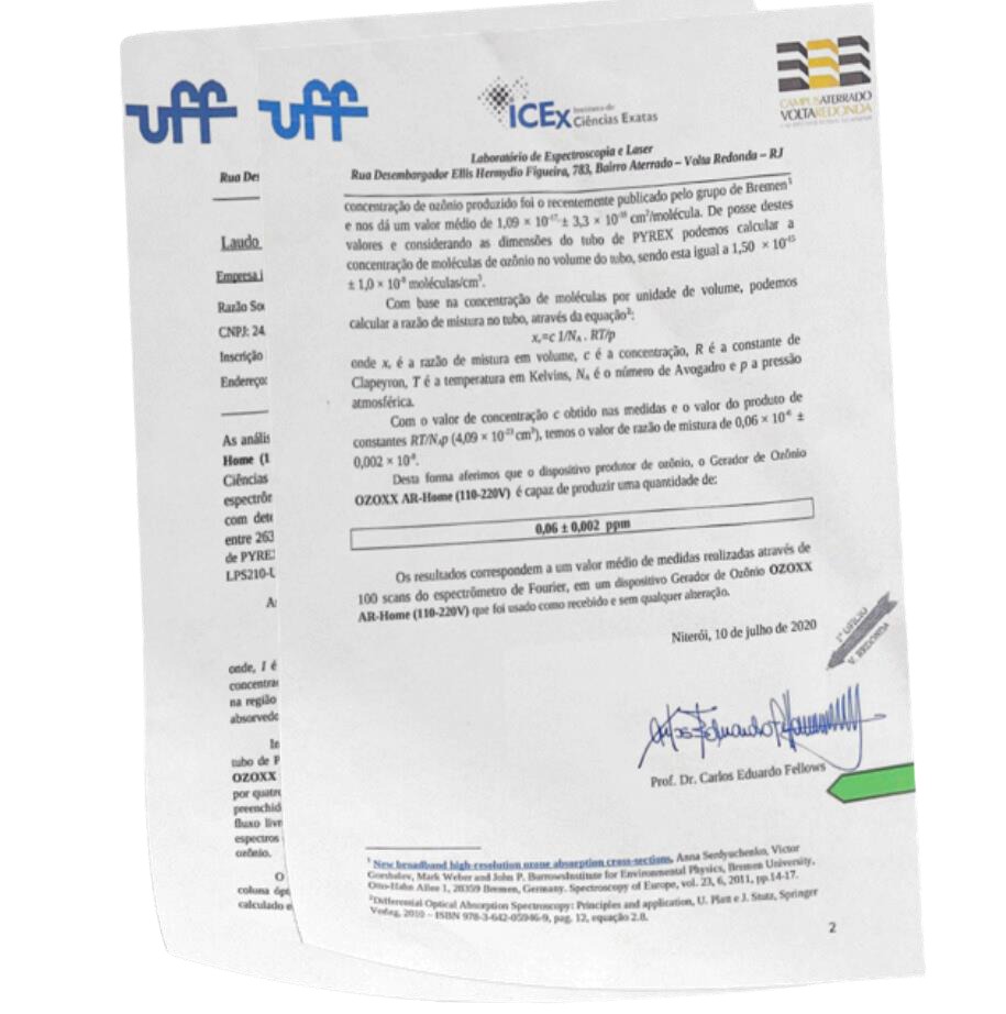 É o único gerador de ozônio com uso adequado para exposição humana, segundo laudo da UFF que comprova sua emissão de 0.06 ppm (estipulado como seguro na NR-15 do Ministério do Trabalho).