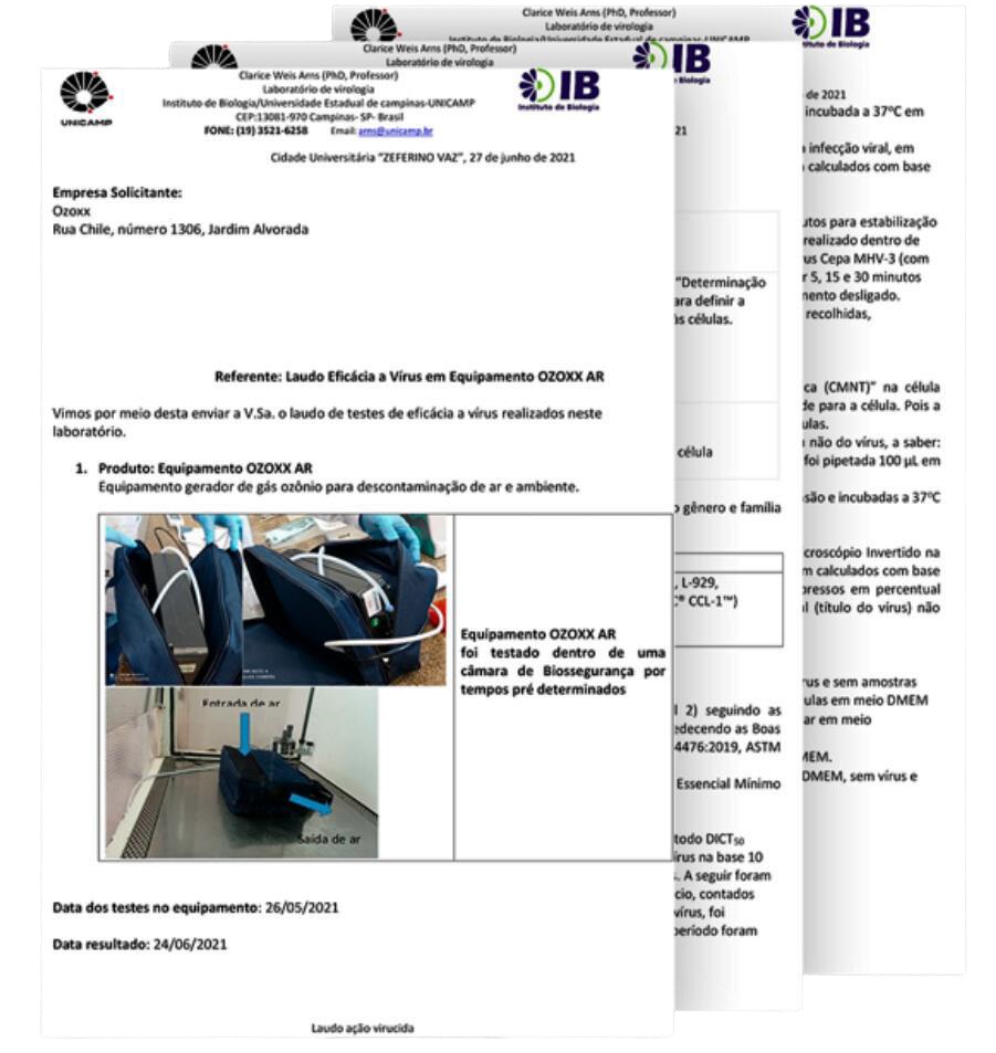 A Ozoxx possui laudo de emissividade pela Universidade Federal Fluminense do Rio de Janeiro, o que permite a exposição humana durante o uso do equipamento no ambiente em que é utilizado, e também o laudo emitido pela Unicamp que comprova sua eficácia contra o Covid 19 em 99.9% e também contra outros vírus, sendo com esse percentual atingido de efetividade, sendo considerado como virucida.